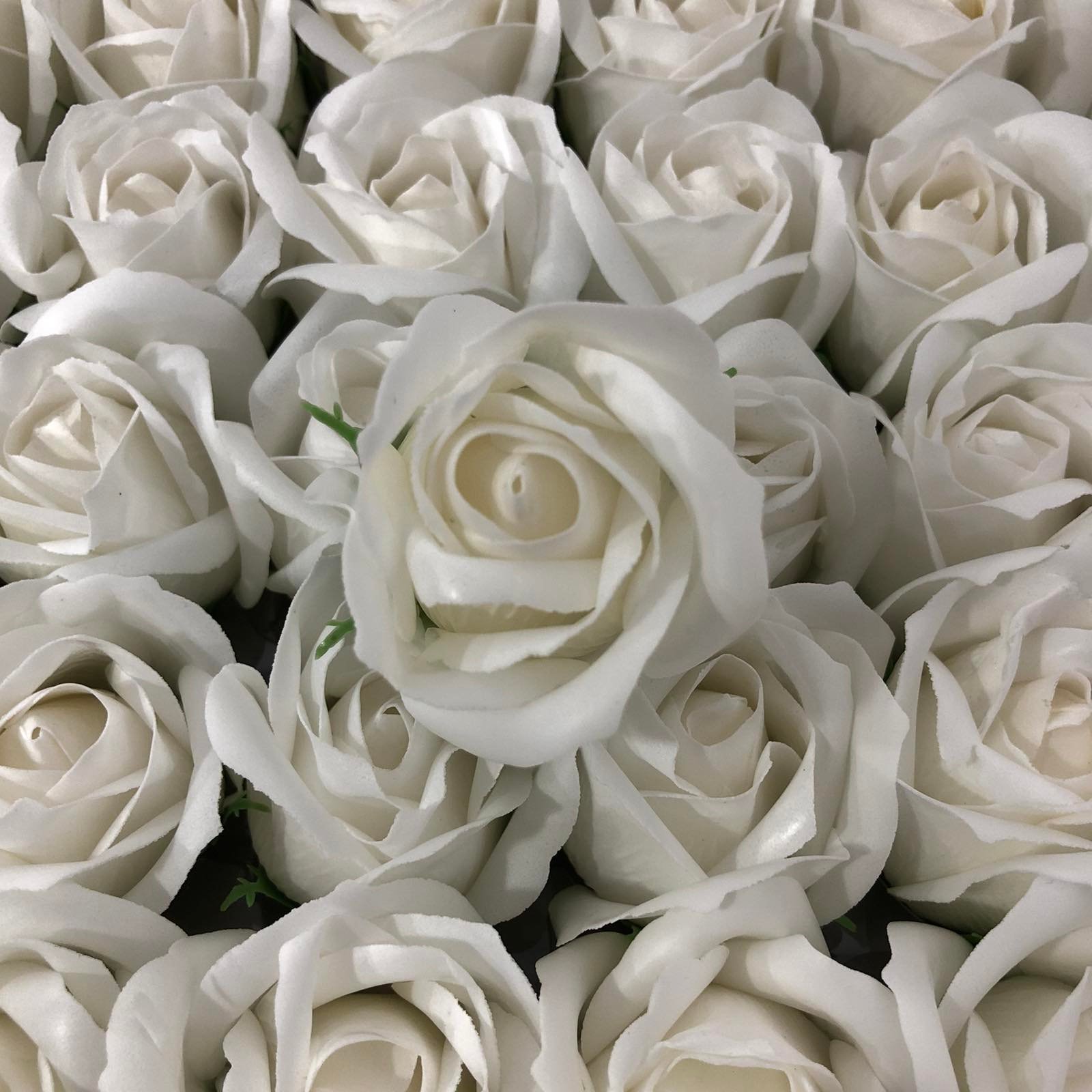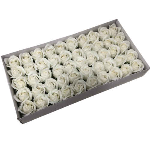 Бели изкуствени рози от мек пластичен ароматен сапун 5см глави. Те могат да бъдат използвани за празнични украси, ръчно изработени подаръци, букети и различни цветни аранжировки. Розите се предлагат в кутия от 50 бр.
