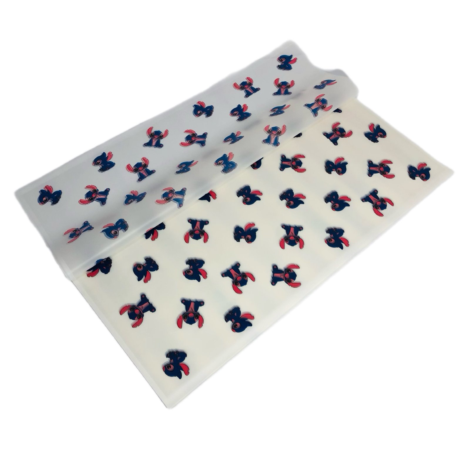 Полупрозрачен целофан със любимият ни стич. Идеален за опаковане на букети, подаръци и други крафт проекти. Оформят се лесно и придават стилна визия на всяка цветна аранжировка или подарък. Предлагат се в пакет от 20 бр листа в размери 58/58см.