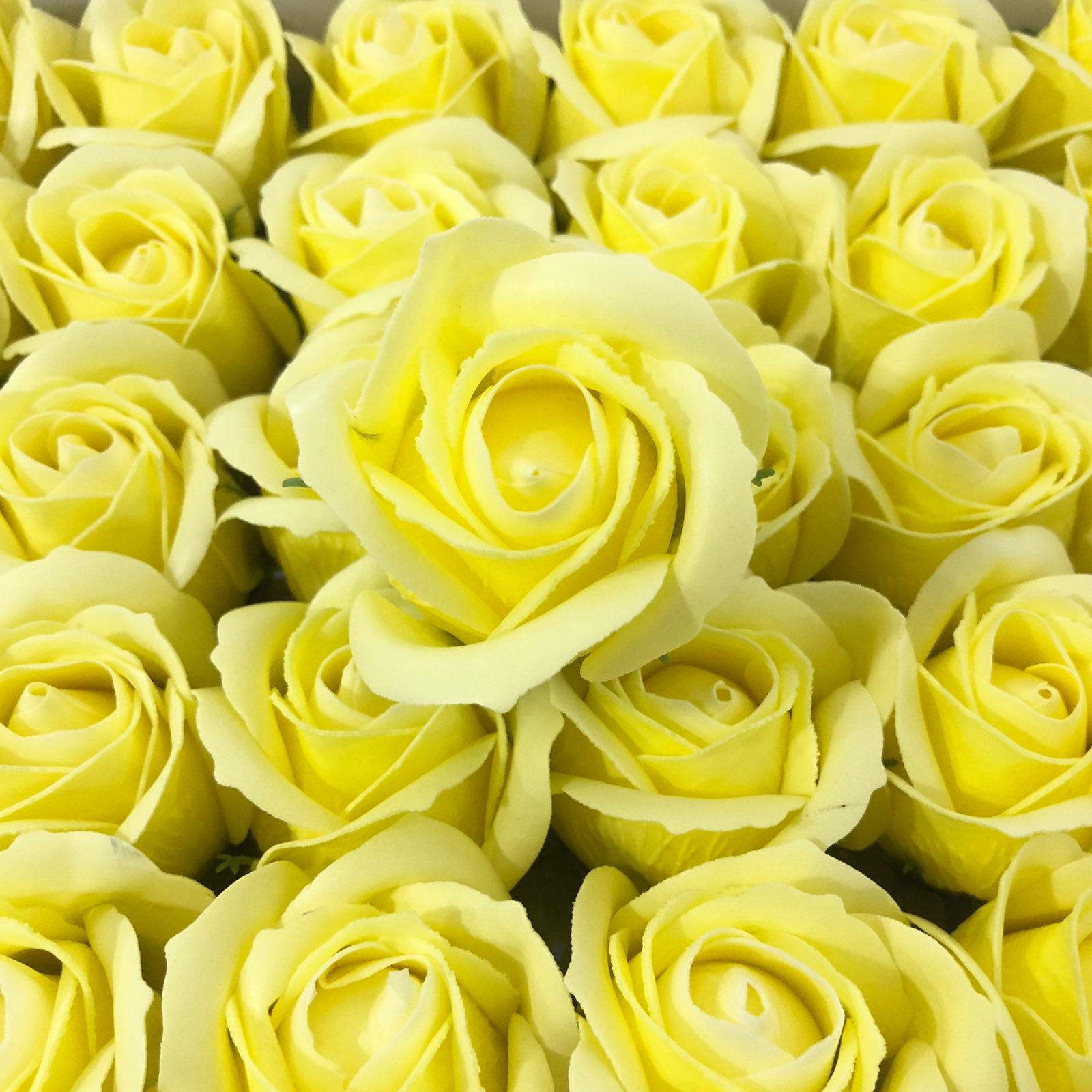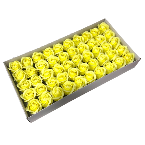 Жълти изкуствени рози от мек пластичен ароматен сапун 5см глави. Те могат да бъдат използвани за празнични украси, ръчно изработени подаръци, букети и различни цветни аранжировки. Розите се предлагат в кутия от 50 бр.