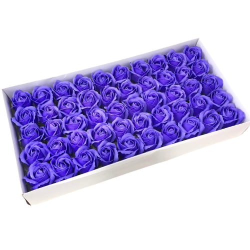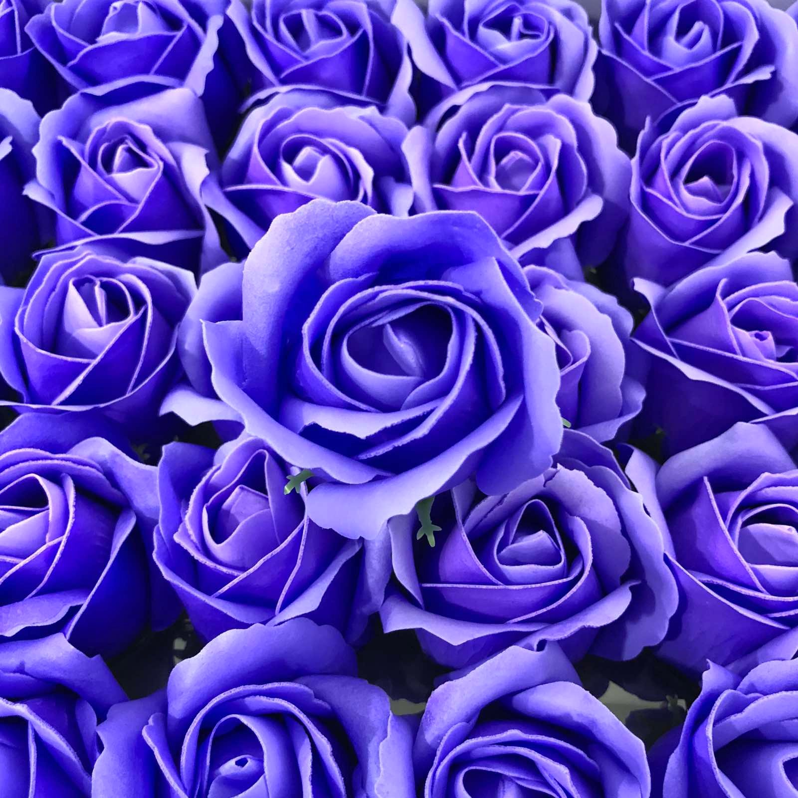 Лилави изкуствени рози от мек пластичен ароматен сапун 5см глави. Те могат да бъдат използвани за празнични украси, ръчно изработени подаръци, букети и различни цветни аранжировки. Розите се предлагат в кутия от 50 бр.